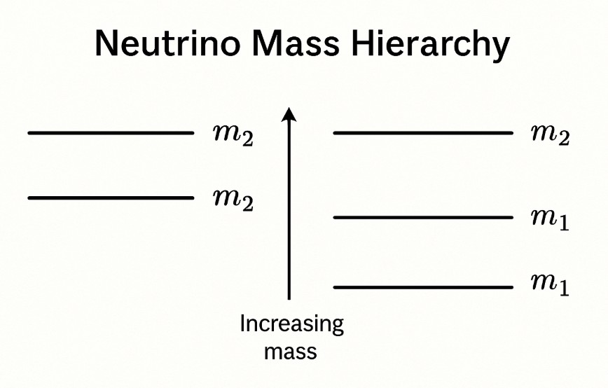 중성미자 진동이 있다는 사실은, 결국 중성미자가 질량을 가지고 있다는 뜻입니다. 하지만 중요한 건, 이들의 정확한 질량이 아니라 상대적인 질량 순서입니다. 물리학자들은 이를 질량 계층 혹은 질량 정렬 문제라 부릅니다. 두가지 시나리오가 있습니다.
